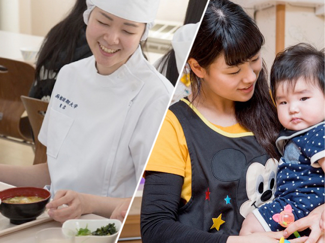 本学は、地域や調理の現場で活躍できる栄養士や、豊かな人間性と確かな専門性を身につけた保育士、幼稚園教諭の養成を基本目的に、食物栄養学科と保育学科の2科を設けています。